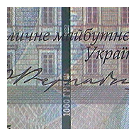 The thread features the denomination “1,000” and Ukraine’s small coat of arms. When looked at from different angles, the thread produces a dynamic light effect – the background image moves in a different direction
