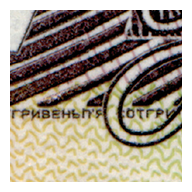 A stripe, fully imbedded into the paper, on which the words “UAH 500”, an element of Ukraine’s small coat of arms (the trident), and the underlined denomination figure “500” can be seen as direct and inverse images under a magnifying glass