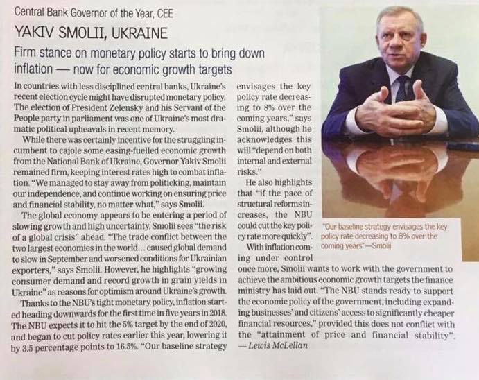 Голова Національного банку України Яків Смолій отримав нагороду "Центробанкір року у Центральній та Східній Європі" у 2019 році від міжнародної газети GlobalMarkets.